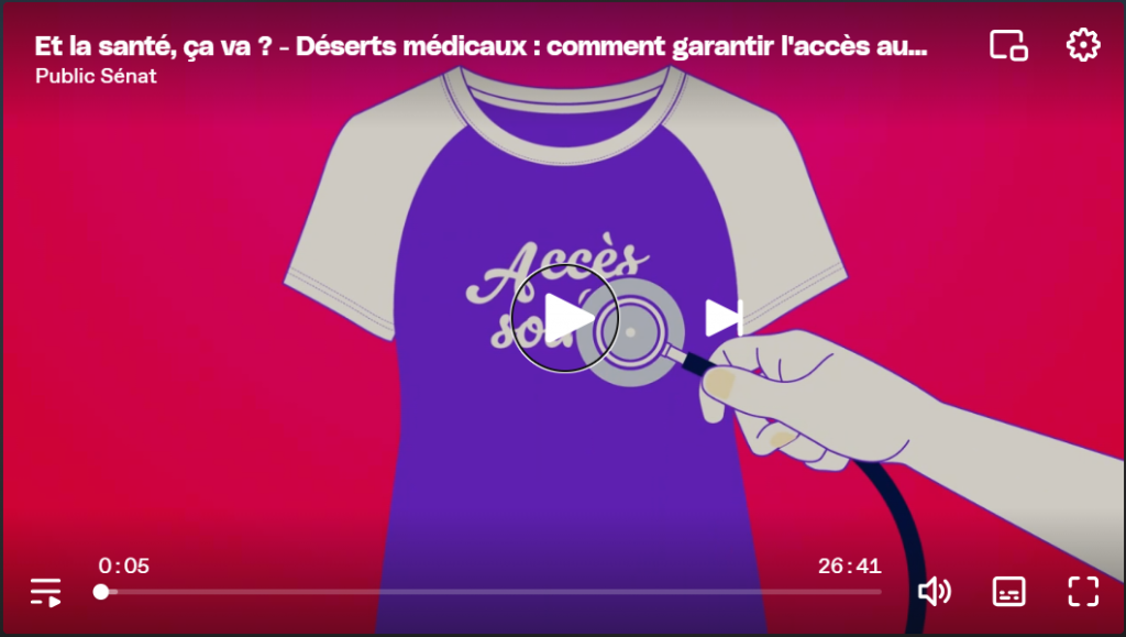 À retrouver dans l’émission Et la santé, ça va? du 18 octobre 2025, présentée par Axel de Tarlé sur Public Sénat, «Déserts médicaux: comment garantir l’accès aux soins?», avec Corinne Imbert, sénatrice de Charente Maritime et rapporteuse de la proposition de loi du Sénat sur la lutte contre les déserts médicaux, et Martial Jardel, jeune médecin fondateur de l’association Médecins Solidaires qui assure des vacations dans des déserts médicaux.