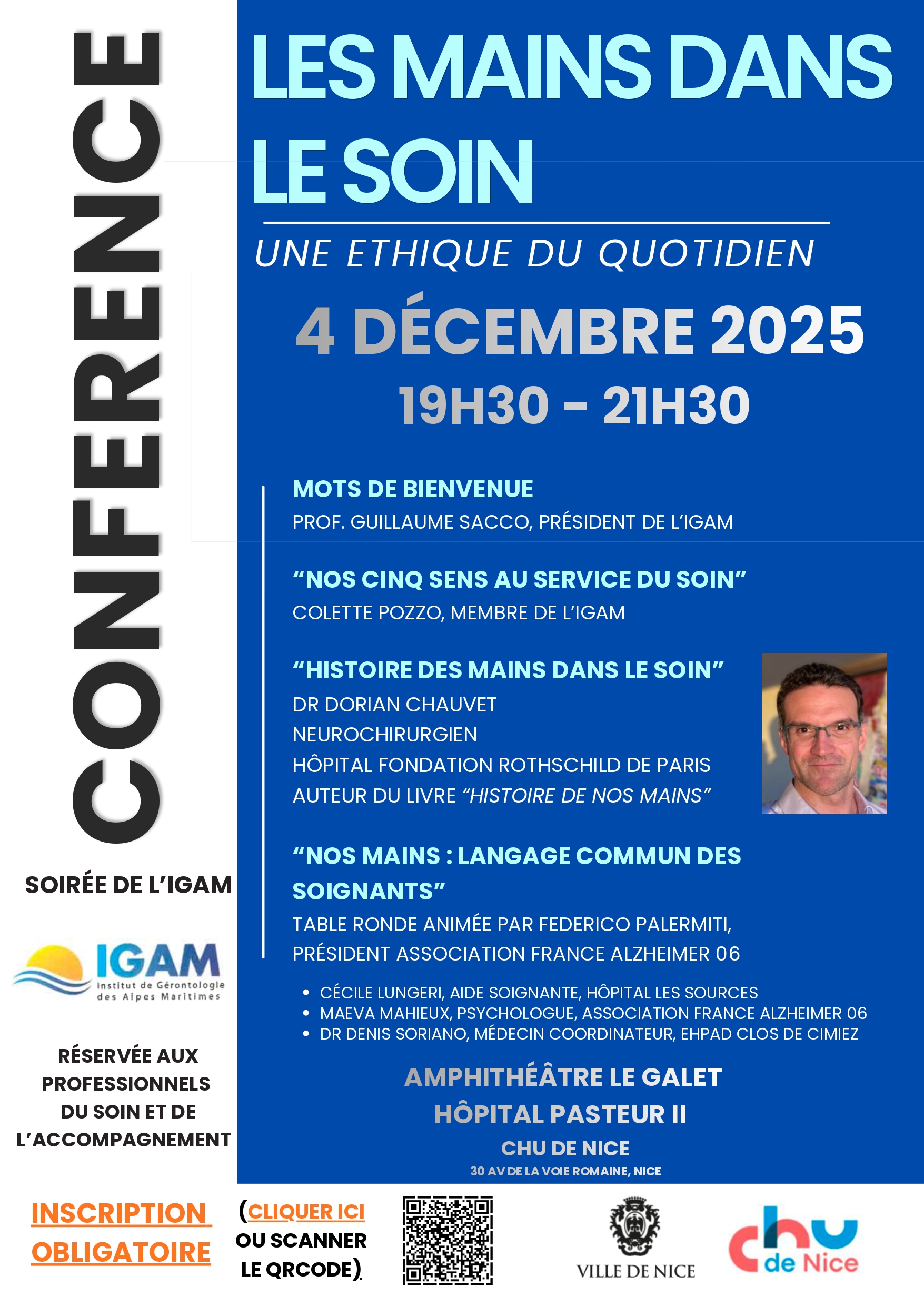 L’IGAM – l’Institut de Gérontologie des Alpes Maritimes – est heureux de vous inviter à une soirée gratuite à destination des professionnels du soin et de l’accompagnement sur la thématique des MAINS DANS LE SOIN, une éthique du quotidien.